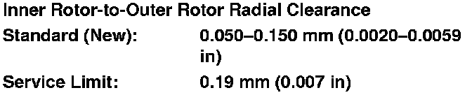 4. Check the pump housing-to-outer rotor radial clearance between the outer rotor (A) and the pump housing (B). If the pump housing-to-outer rotor radial clearance exceeds the service limit, replace the oil pump.