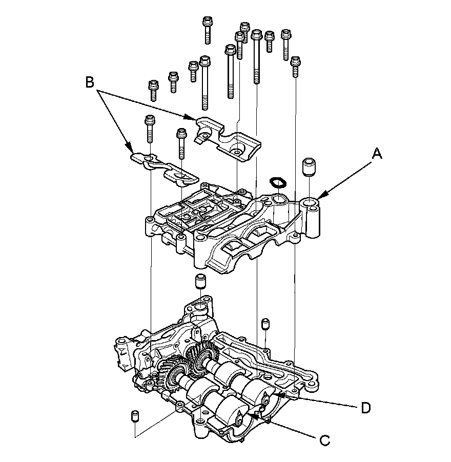 4. Remove the upper balancer shaft holder (with bearings) (A) and the baffle plates (B), then remove the front balancer shaft (C) and the rear balancer shaft (D).