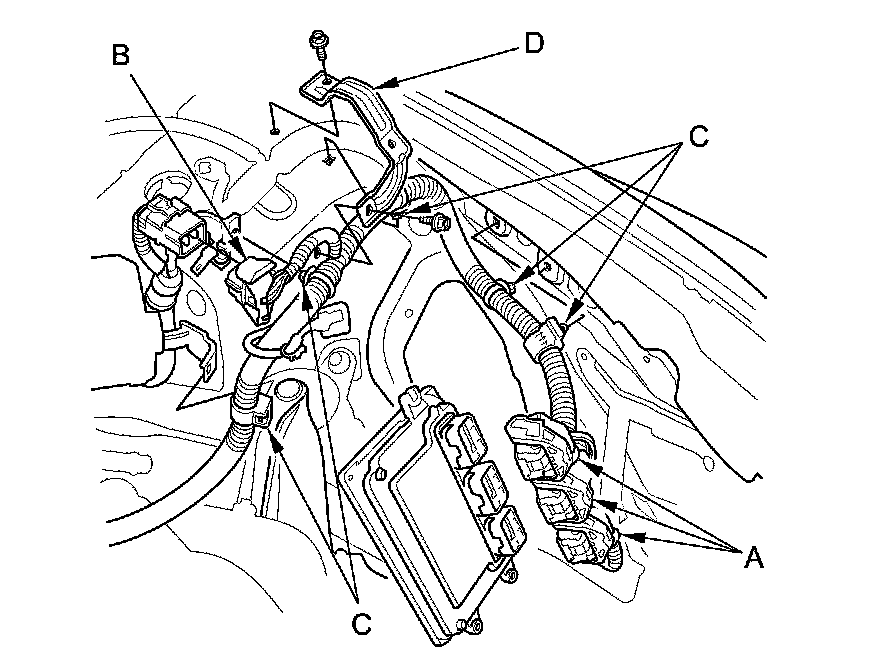 11. Disconnect the harness connector (B), and remove the harness connector from the bracket (C).