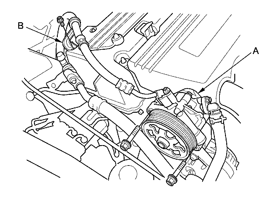 34. Remove the bolt (A) securing the power steering fluid line bracket, and unclamp the power steering fluid line clamp (B) on the front subframe.