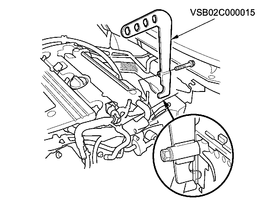 - Be careful not to damage the hood opener cable when installing the engine support hanger at the front bulkhead.