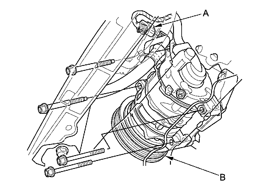 51. Disconnect the A/C compressor clutch connector (A), then remove the A/C compressor (B) without disconnecting the A/C hoses. Do not bend the A/C hoses excessively.