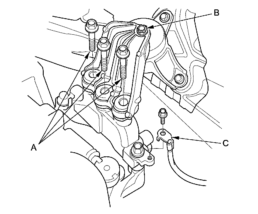 44. Disconnect the vacuum hose (A) and remove the front engine mount stop (B), then remove the front engine mount mounting bolt (C).