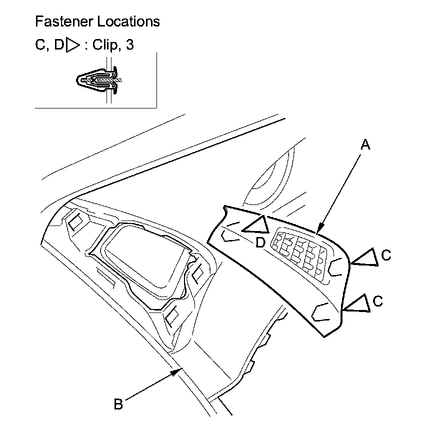 2. Pull out the side defogger vent trim to detach the upper clip (D), then remove the trim.