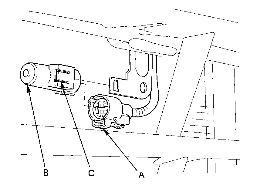 2. Lift the tab (C) to release the lock, then remove the outside air temperature sensor from the front bumper.