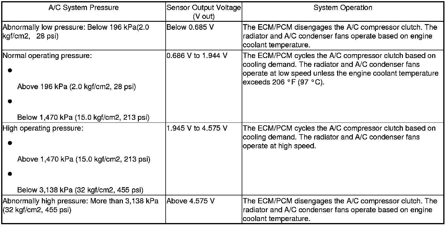 NOTE: When the refrigerant is below 196 kPa (2.0 kgf/cm2, 28 psi) or above 3,138 kPa (32 kgf/cm2, 455 psi), the ECM/PCM turns the A/C compressor clutch relay off to protect the A/C compressor. When the refrigerant pressure is above 1,470 kPa (15.0 kgf/cm2, 213 psi), the ECM/PCM switches the radiator and A/C condenser fans to high speed.