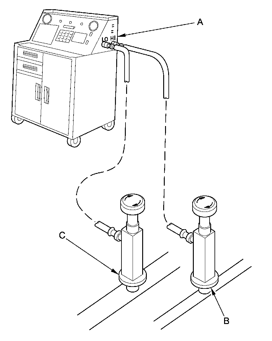 2. Connect an R-134a refrigerant recovery/recycling/charging station (A) to the high-pressure service port (B) and the low-pressure service port (C), as shown, following the equipment manufacturer's instructions. Recover the refrigerant, if any, from the A/C system A/C Refrigerant Recovery.