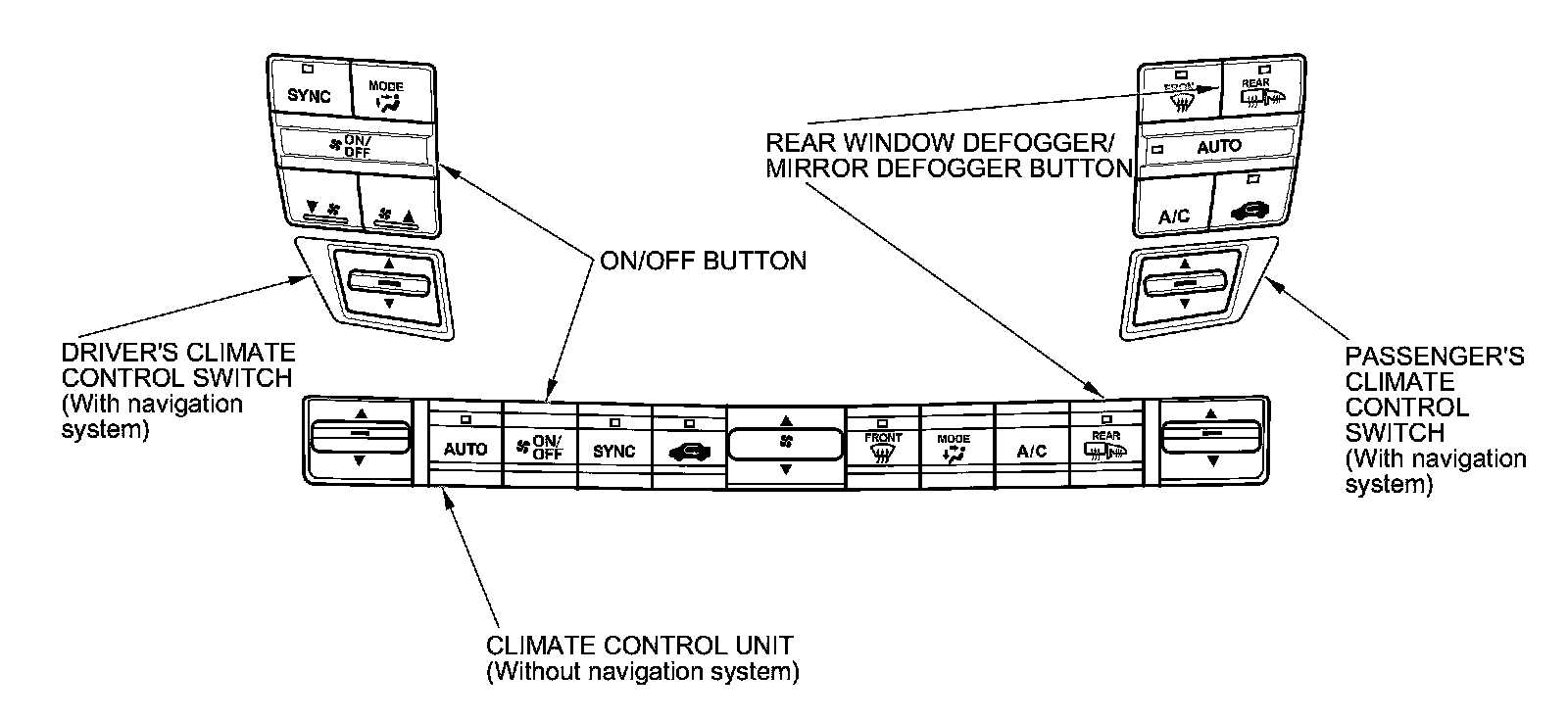 2. Press and hold the OFF button ('08-09 models) or ON/OFF button ('10-11 models), then within 10 seconds press and release the REAR WINDOW DEFOGGER/MIRROR DEFOGGER button five times. Release the OFF button('08-09 models) or ON/OFF button ('10-11 models); then the self-diagnosis begins.