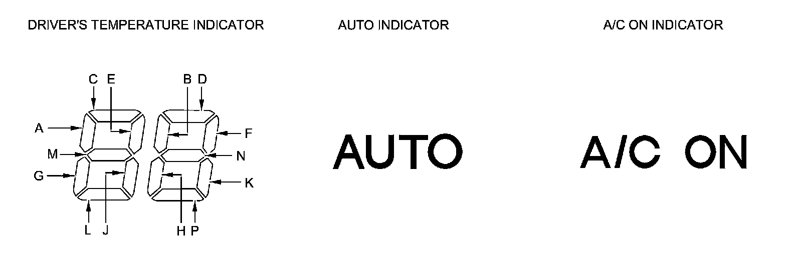 NOTE: If indicator segments A, C, D, E, G, K, and the AUTO indicator or the A/C ON indicator, are on at the same time, there may be an open in the climate control unit ground circuit.