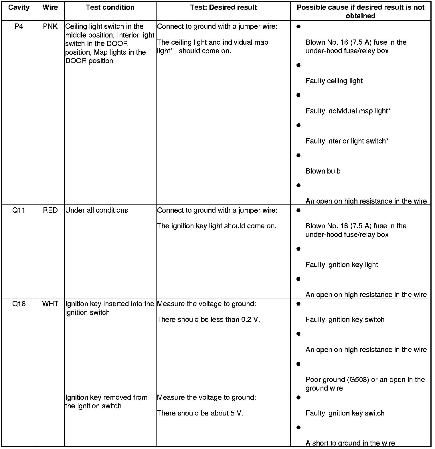 8. Reconnect the connectors to the passenger's under-dash fuse/relay box, and do these input tests at the following connectors.