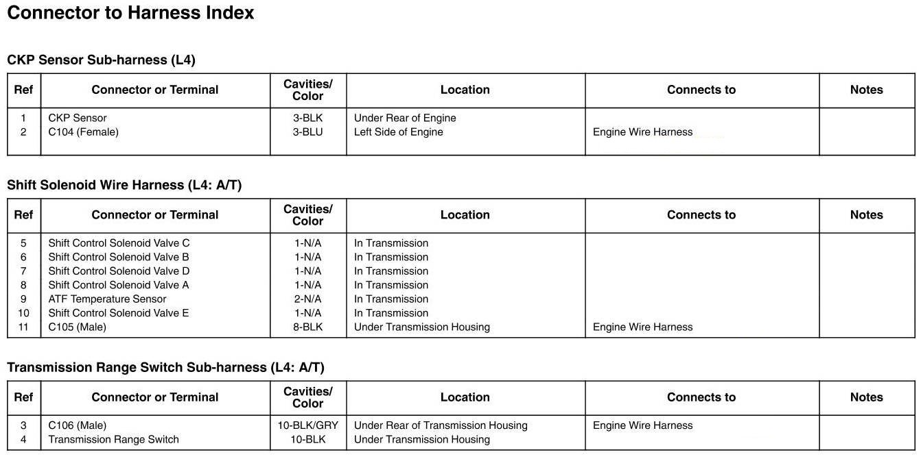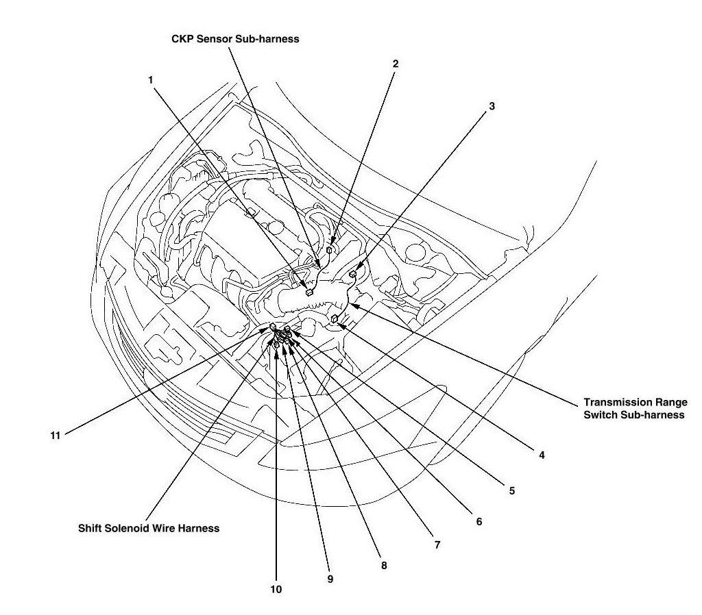 CKP Sensor Subharness, Shift Solenoid Wire Harness, And Transmission Range Switch Subharness Connector And Harness Locations