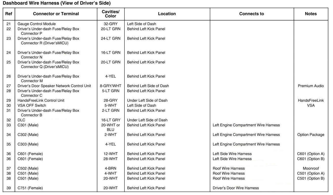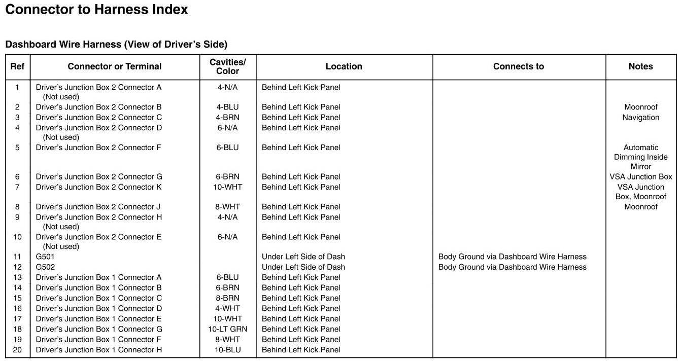 Dashboard Wire Harness (View Of Driver's Side) Connector And Harness Locations