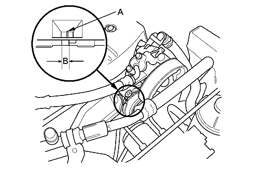 2. Check the position of the auto-tensioner indicator's pointer (A) is within the standard range (B) as shown. If it is out of the standard range, replace the drive belt Service and Repair.