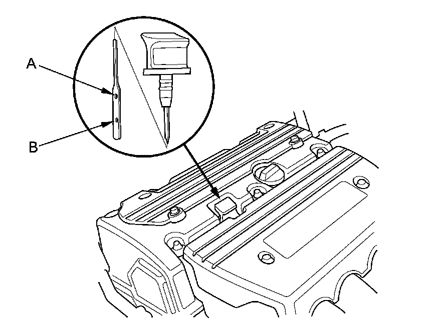 3. Remove the dipstick, and check the engine oil level. It should be between the upper mark (A) and the lower mark (B).