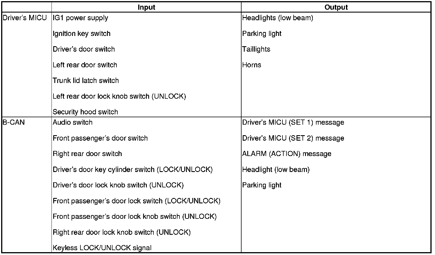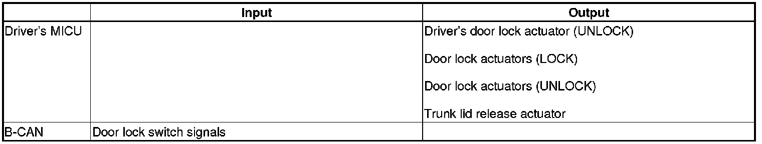 The driver's MICU control of the door lock actuators LOCK, UNLOCK, DRIVER'S UNLOCK, TRUNK UNLOCK is based on B-CAN door lock switch signals.