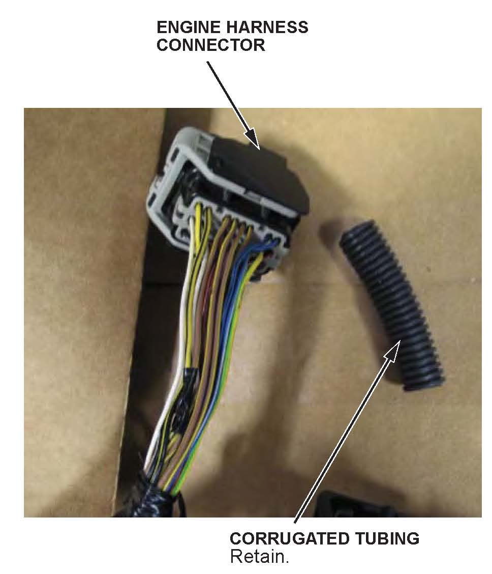 7. Unwrap and discard the tape from the corrugated tubing closest to the engine harness connector, then remove the corrugated tubing. Retain the tubing for reinstallation. Unwrap and discard the tape under the tubing to expose the wires going into the engine harness connector.