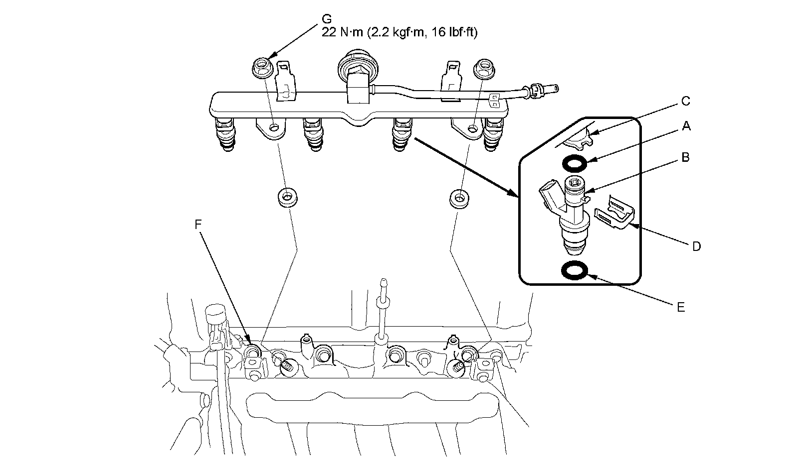 13. Install the fuel rail and the injectors in the injector base (F).