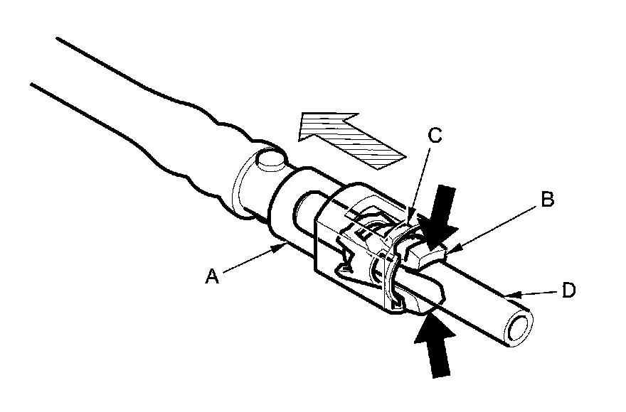4. Place a rag or shop towel over the quick-connect fitting. Hold the connector (A) with one hand, and squeeze the retainer tabs (B) with the other hand to release them from the locking tabs (C). Pull the connector off.