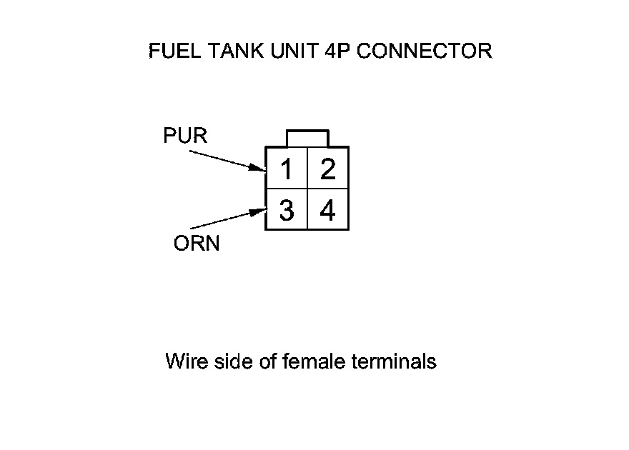 7. Measure the voltage between fuel tank unit 4P connector terminals No. 1 and No. 3 with the ignition switch turned to ON (II). There should be battery voltage.