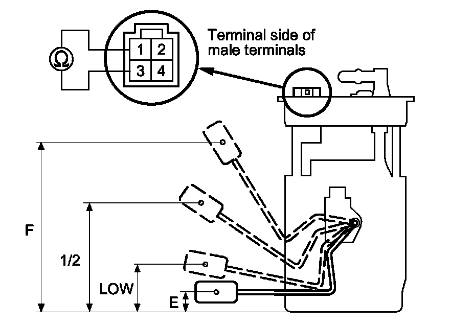 10. Measure the resistance between fuel tank unit 4P connector terminals No. 1 and No. 3 with the float at E (EMPTY), LOW (LOW FUEL INDICATOR), 1/2 (HALF FULL), and F (FULL) positions.