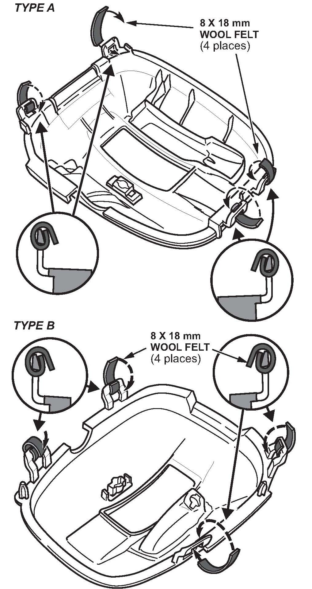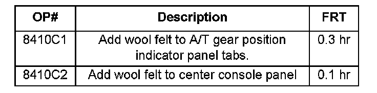 14. Inspect the felt on the center console panel for proper installation. Make sure the felt is properly attached and in the correct position (touching the parting line). If any of the felt is not in contact with the console panel, or is not touching the parting line, replace it by cutting a 200 mm x 5 mm piece of felt and applying it as shown.