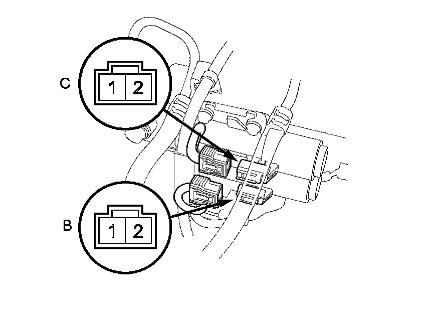 9. Connect a jumper wire from the battery negative terminal to A/T clutch pressure control solenoid valve B or C connector terminal No. 2, and connect another jumper wire from the battery positive terminal to A/T clutch pressure control solenoid valve B or C connector terminal No. 1.