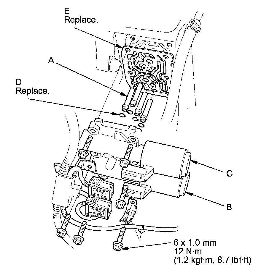11. Remove the ATF joint pipes (A), the O-rings (D), and the gasket (E).