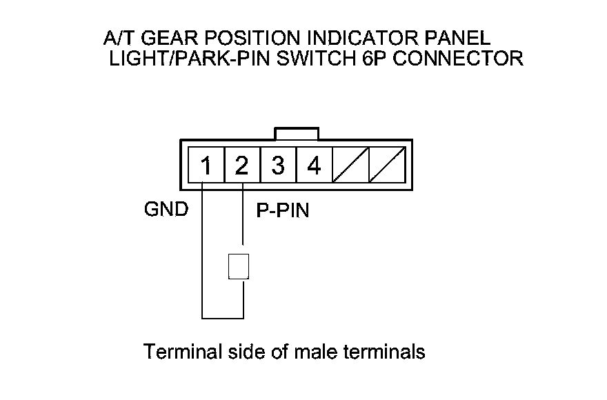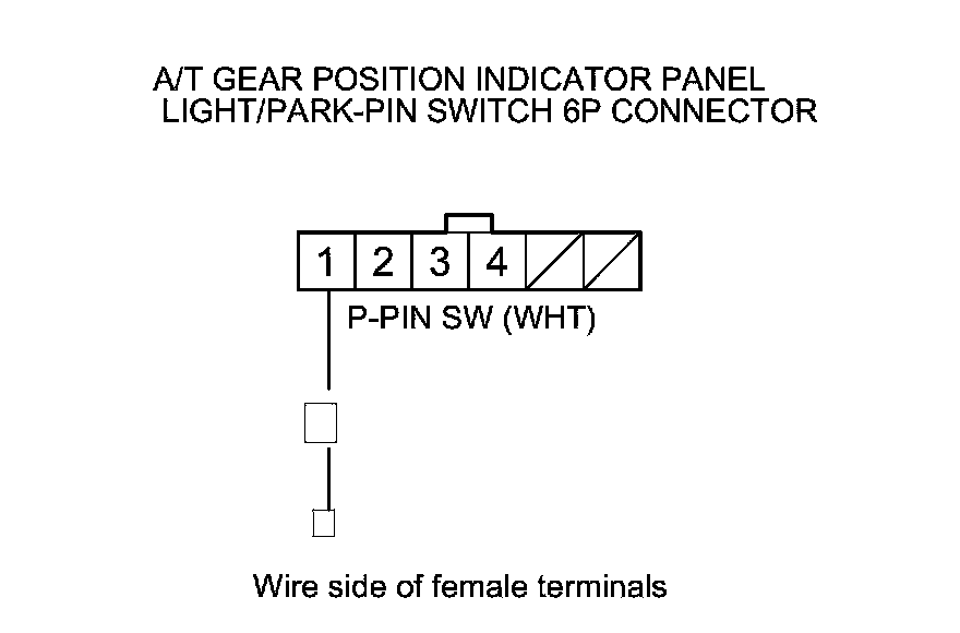 13. Check for continuity between A/T gear position indicator panel light/park-pin switch 6P connector terminals No. 1 and No. 2. Do not push the shift lever button.