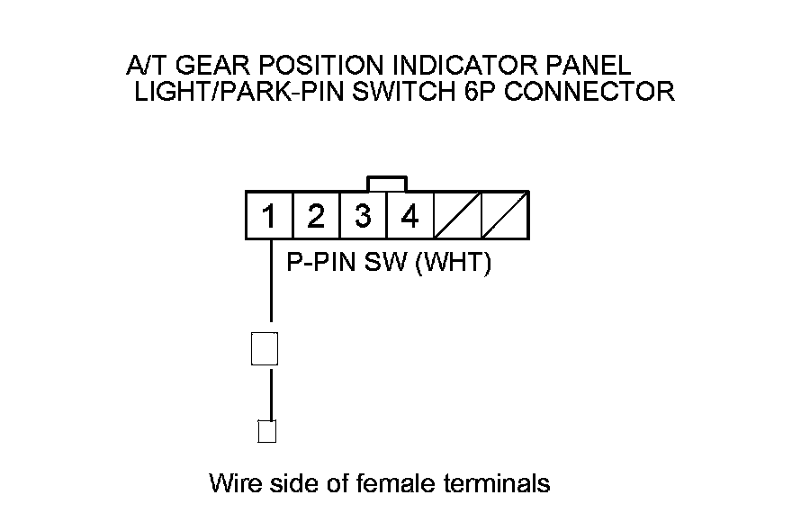 13. Check for continuity between A/T gear position indicator panel light/park-pin switch 6P connector terminals No. 1 and No. 2. Do not push the shift lever button.