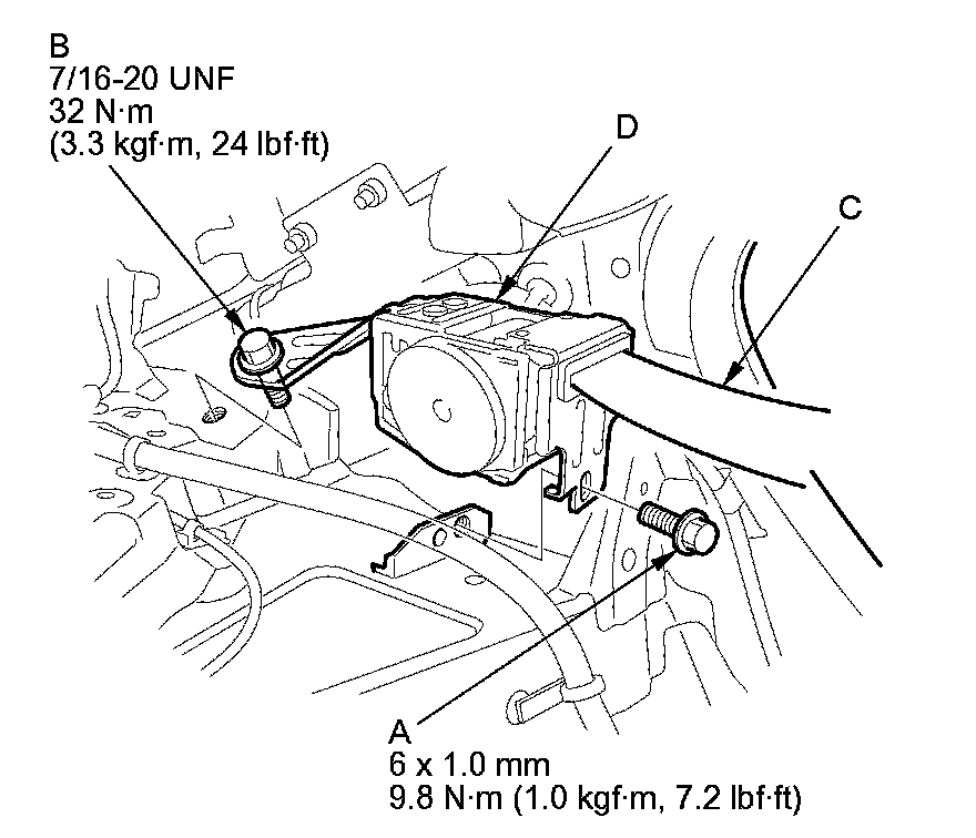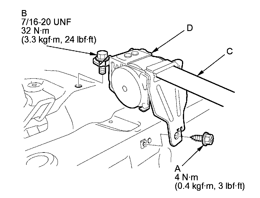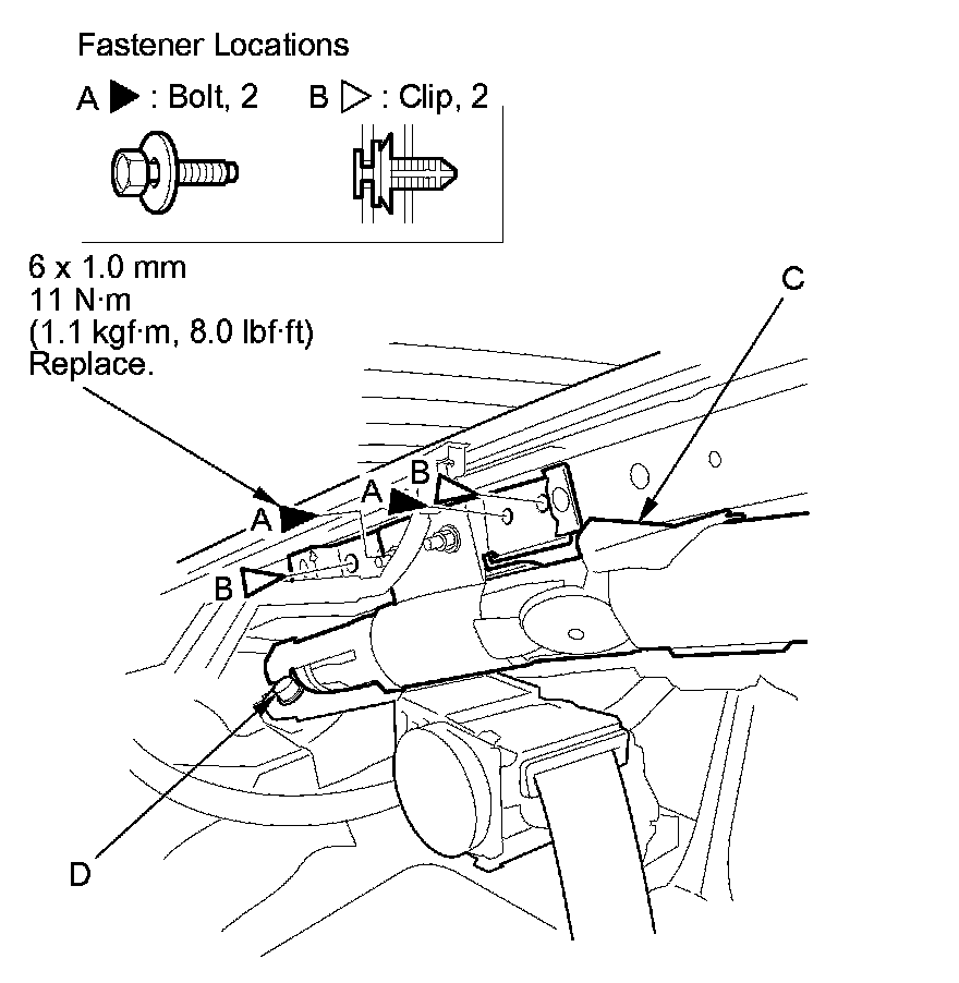 6. Remove the retractor mounting tapping screw (A) and the retractor bolt (B), then remove the center seat belt (C) and the retractor (D). 4-door is shown; 2-door is similar.