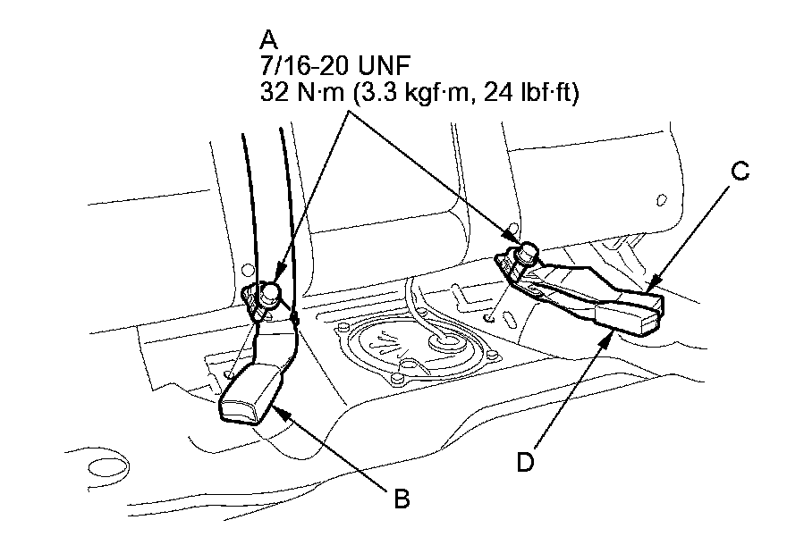 2. Remove the center anchor bolts (A), then remove the right seat belt buckle (B), the center seat belt buckle (C), and the left seat belt buckle (D).