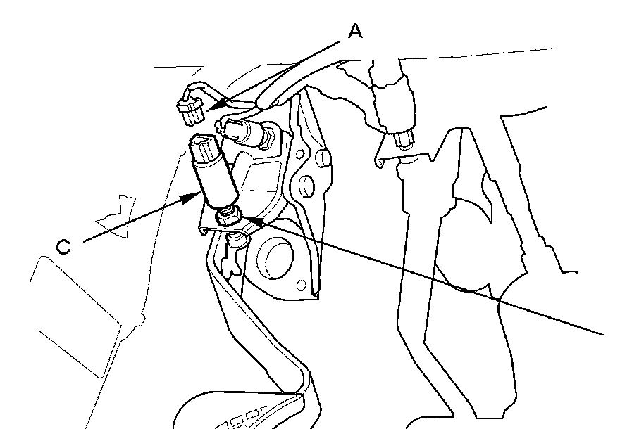 2. Loosen the locknut (B), then remove the clutch pedal position switch (C).