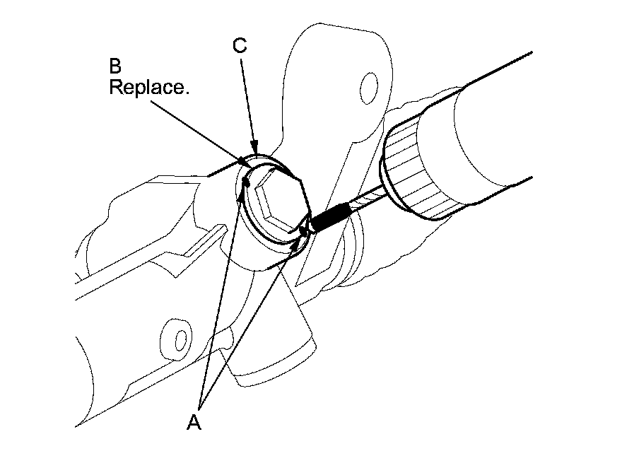 81. Remove the old sealant from the threads on the gearbox housing (B), and apply new sealant (Three Bond 1215 or Loctite 5699) all the way around the threads on the gearbox housing and the new end plug (C). Install the end plug onto the gearbox housing, and tighten it to the specified torque.