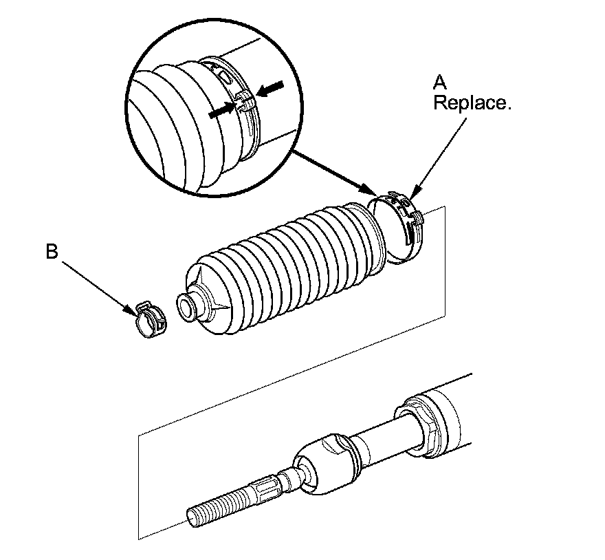 5. Remove the boot bands (A) and tie-rod clips (B). Pull the boot away from the ends of the steering gearbox.
