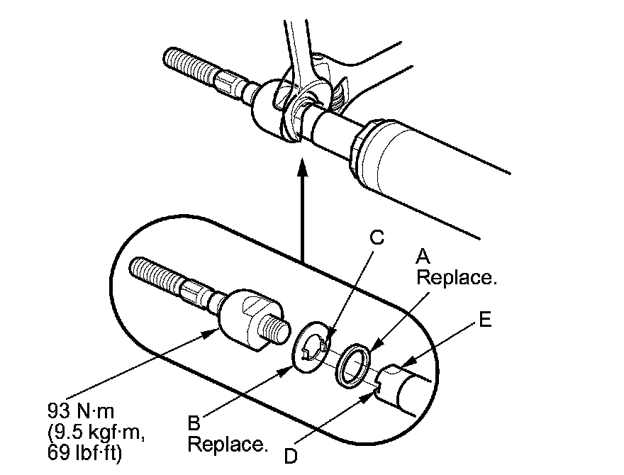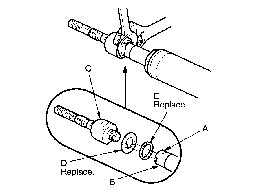 74. Install a new rubber stop (A) and a new lock washer (B). Align the lock washer tabs (C) with the slots (D) on the rack end (E) while holding the lock washer in place. Repeat this step for the other side of the rack.