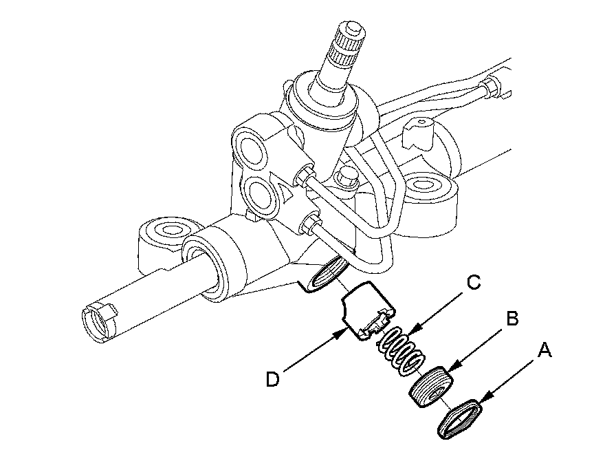 41. Apply power steering fluid to the surface of the pinion shaft (A). Slide the sleeve (B) onto the pinion shaft by aligning the locating pin (C) on the pinion shaft with the cutout (D) in the sleeve. Then install the new snap ring (E) securely in the pinion shaft groove. Be careful not to damage the valve seal ring when installing the sleeve.
