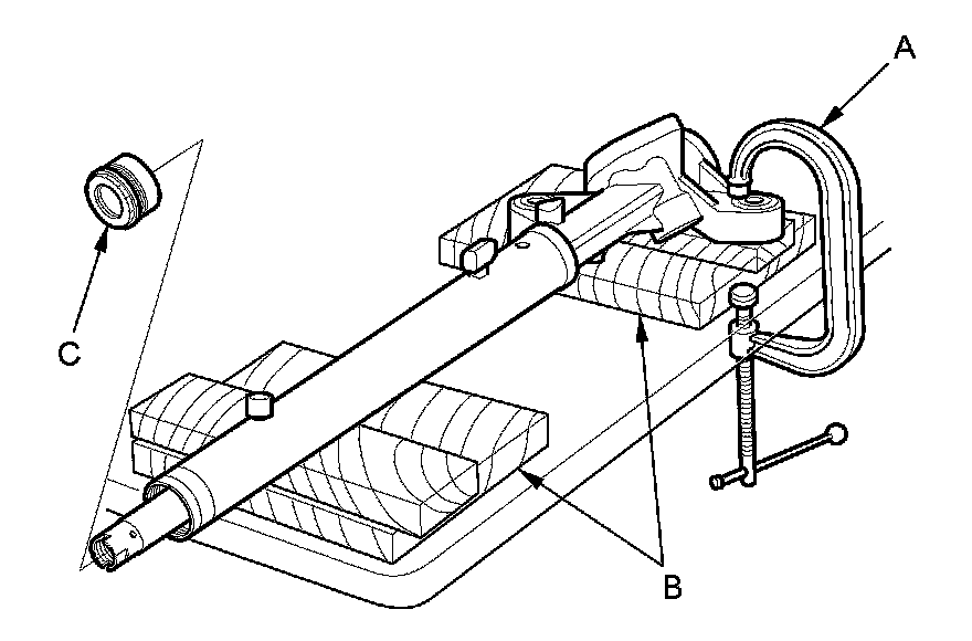 59. Install the backup ring (B) and cylinder end seal (C) into the bottom of the cylinder by pressing on the tool with a press. Do not push on the tool with excessive force as it may damage the backup ring and cylinder end seal.