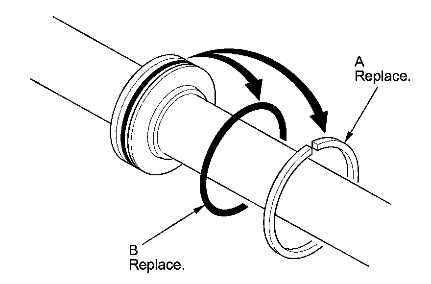 56. Install the new backup ring (A) on the steering rack, then place the backup ring and cylinder end seal (B) against the piston (C).