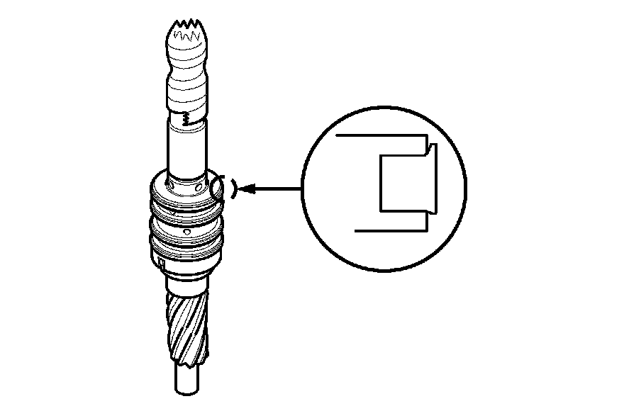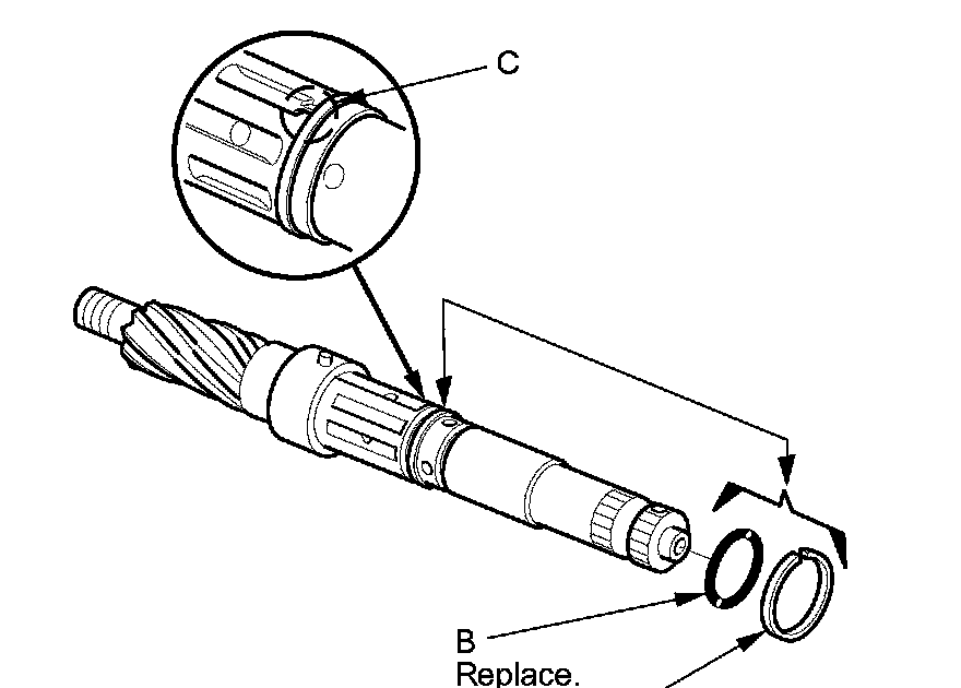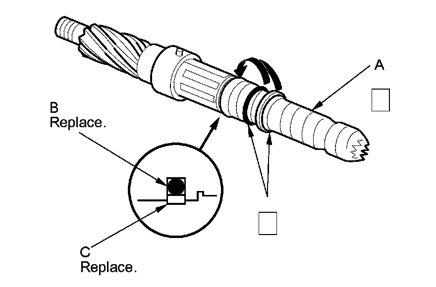 29. Using a cutter or an equivalent tool, cut the valve seal ring (A) and O-ring (B) at the cutting groove position (C) in the pinion shaft. Remove the valve seal ring and O-ring. Be careful not to damage the edges of the pinion shaft groove and outer surface when removing the valve seal ring and O-ring.