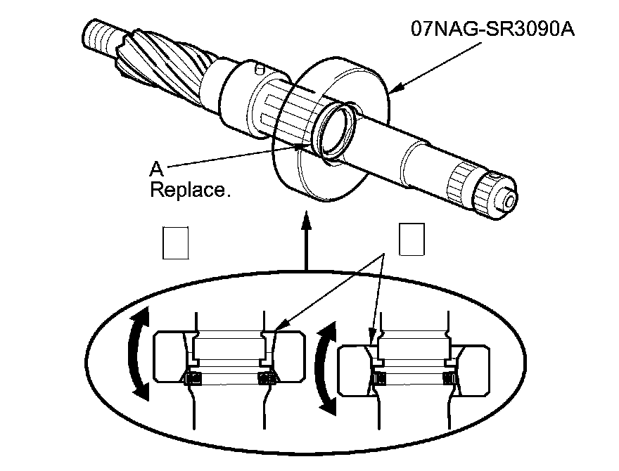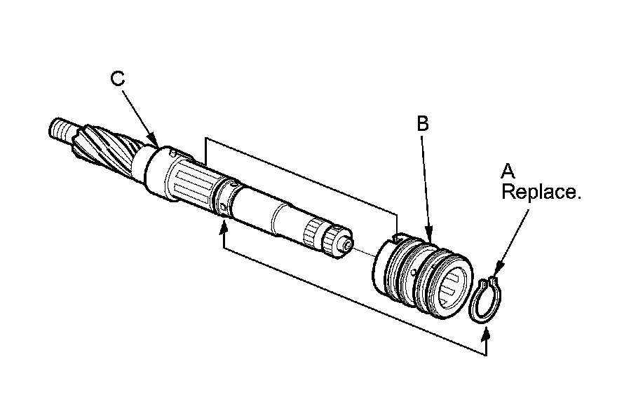 27. Remove the snap ring (A) and the sleeve (B) from the pinion shaft (C).