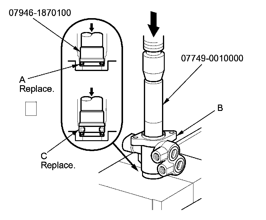 43. Press the new roller bearing (C) into the valve housing with a hydraulic press and attachment.