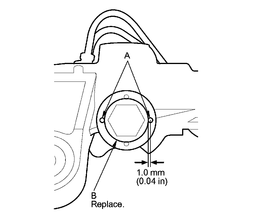3. Drill a 4.0 mm (0.16 in) diameter hole about 2.5-3.0 mm (0.10-0.12 in) in depth in the staked points (A) on the end plug (B) and the gearbox housing (C).