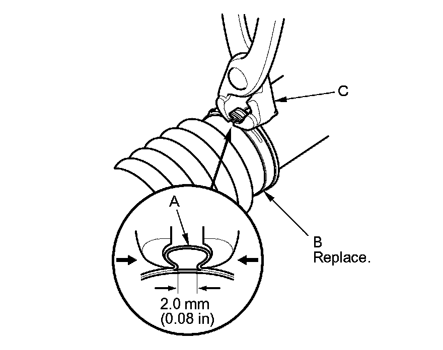 87. Close the ear portion (A) of the boot band (B) with commercially available pincers, Oetiker 1098 or equivalent (C).
