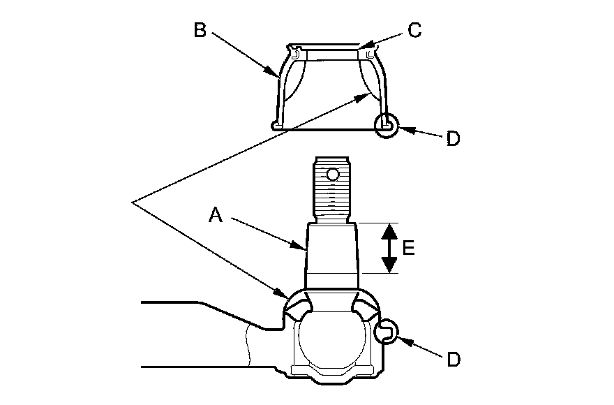 - Keep grease off the boot mounting area (D) and the tapered section (E) of the ball pin.
