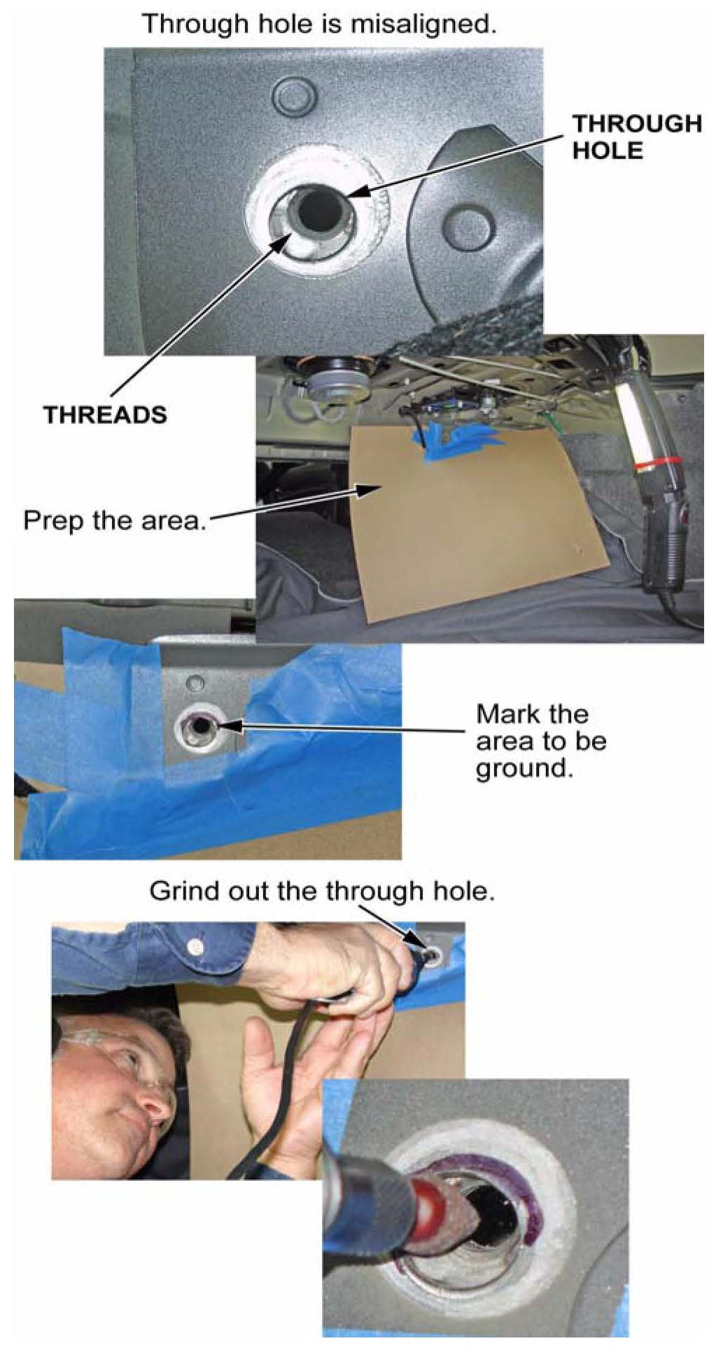 ^ If the holes cover the threads, grind out a small portion of the wheel house extension hole so the bolt threads don't touch the edge of the hole. Go to step 5.