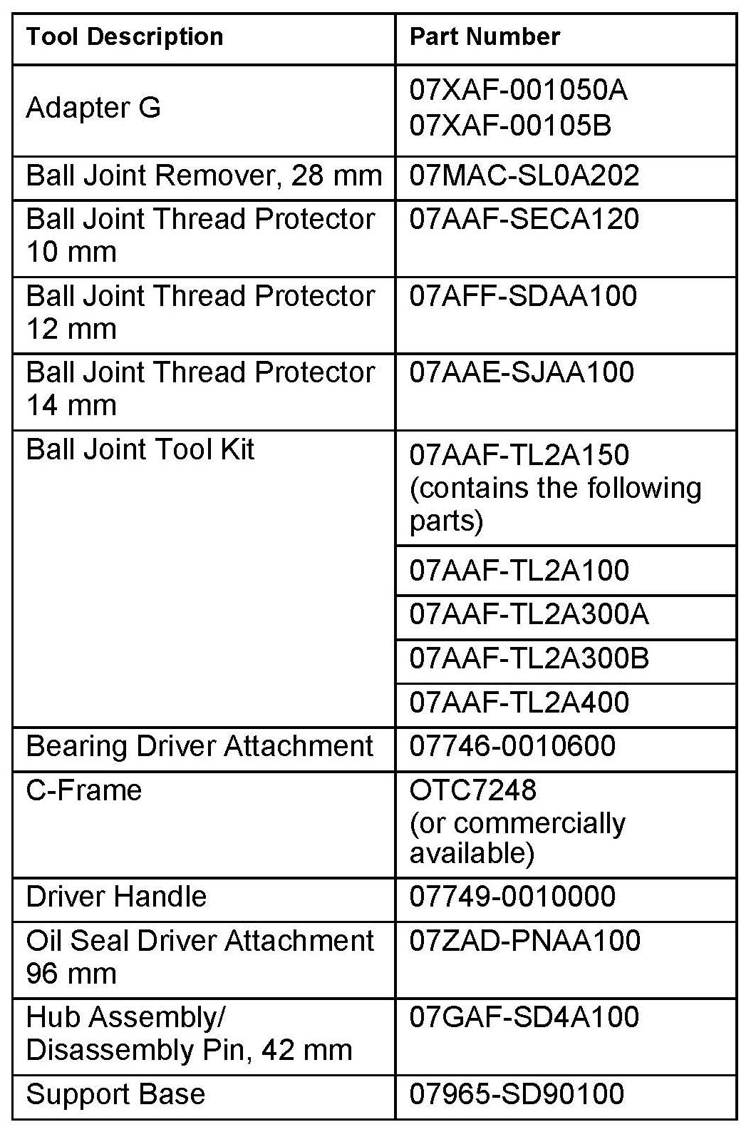 31. Remove the ball joint tool attachments (07AAF-TL2A300-A and B) from the hub.