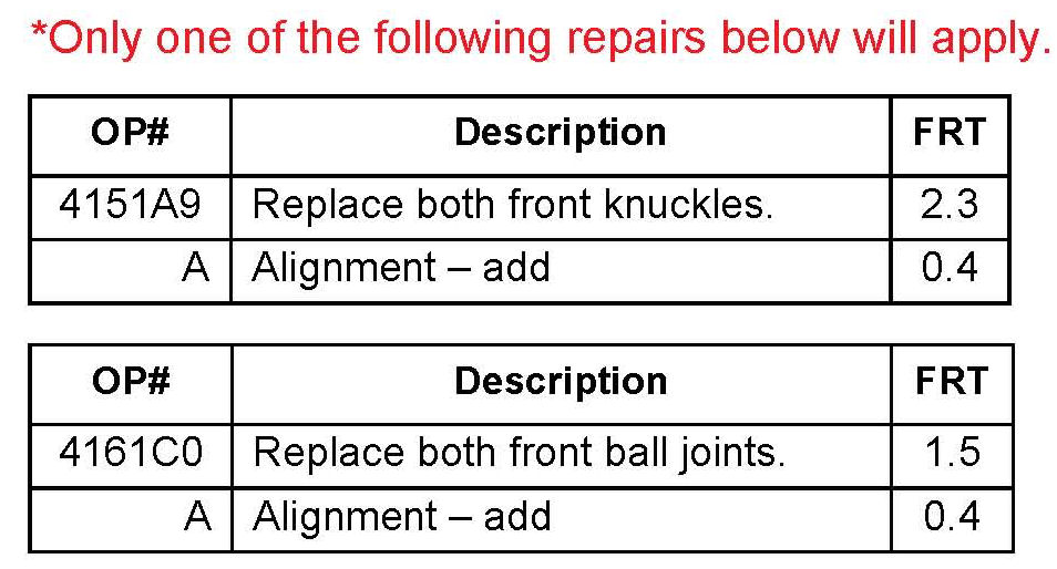 Replace both of the front lower ball joints with updated service parts made to address this specific symptom. If the ball joints were previously replaced, then replace both front knuckle assemblies.