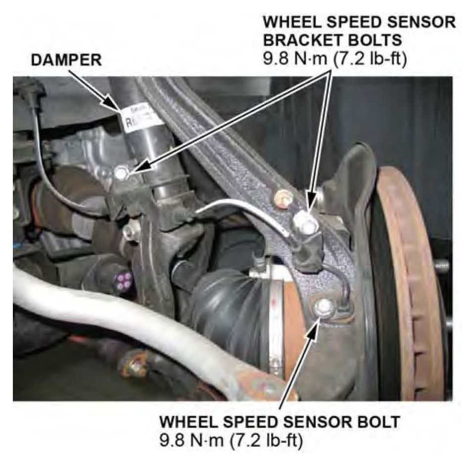 4. Remove the wheel speed sensor and its harness brackets at the knuckle assembly and at the damper assembly. Do not disconnect the wheel speed sensor connector.
