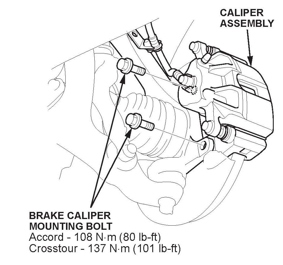6. Remove the brake caliper bracket mounting bolts, then remove the caliper assembly from the knuckle. To prevent damage to the caliper assembly or the brake hose, use a short piece of wire to hang the caliper assembly from the undercarriage. Do not twist the brake hose excessively.