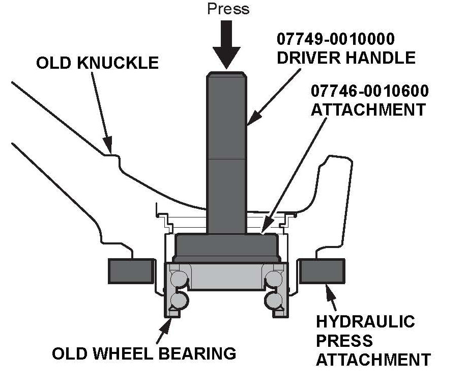 20. Press the wheel bearing out of the knuckle using the driver handle, the attachment, and a press.